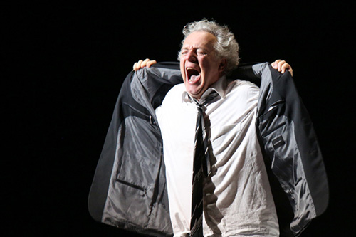 Zentrale Figur dieser „Blaubart“-Wiederaufnahme war der Bariton Johannes Martin Kränzle in der Titelrolle. Das Geschehen auf der düsteren, leergeräumten Bühne wird ja im wesentlichen vom ihm und seiner Frau Judith (Claudia Mahnke) bestimmt, darüber hinaus sind es lediglich stumme Rollen. Kränzle aber vereinigte stimmliche Ausdruckskraft mit darstellerischen Fähigkeiten, auf die es bei jeder Öffnung der sieben geheimnisvollen Türen wieder neu ankam. Wie sich Kränzle plötzlich zu Boden warf und - wie vom Stromschlag getroffen - zu zucken und zittern begann, das muss ihm erst einmal jemand nachmachen.